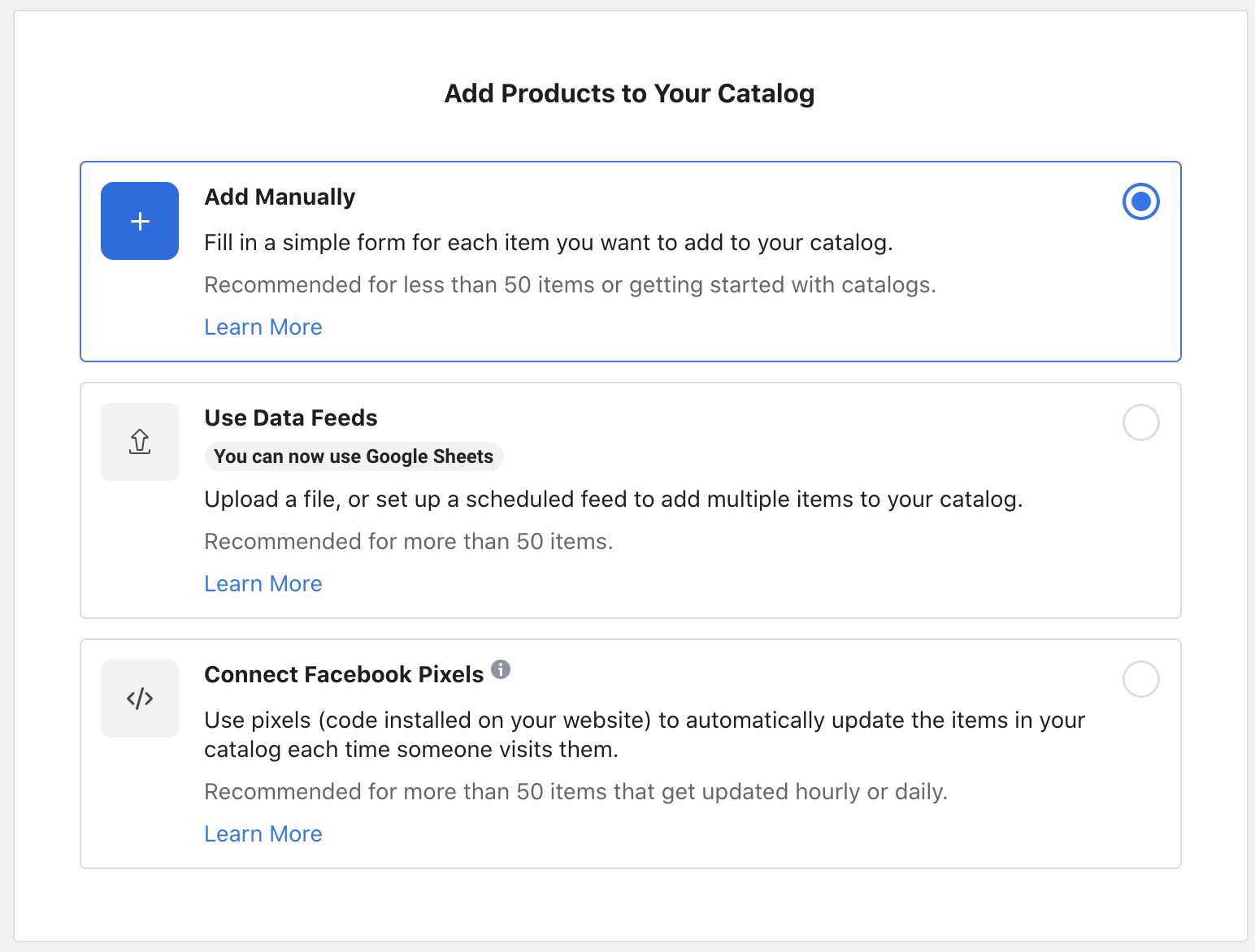 If you don’t utilize one of these platforms or you don’t have a website at all even, Facebook has a few other methods of adding your inventory including manually (for a few items) or by uploading your inventory via a datafile spreadsheet which they will walk you through how to set up. Once your catalog is set up you will be able to customize your storefront even further.